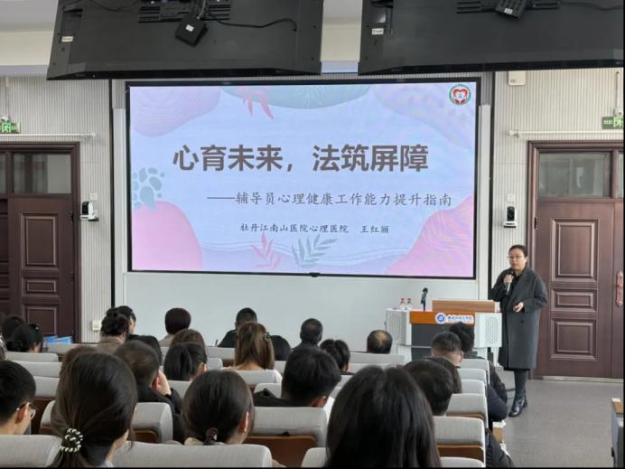 王红丽副院长以《心育未来,法筑屏障——高校辅导员心理健康工作能力提升指南》为题,系统阐述了大学生心理发展阶段、健康标准、当前现状与常见困扰,并重点从“知情意”统一的角度,解析了心理异常信号的识别要点与应对策略。她结合丰富的一线临床案例,深入解读《中华人民共和国精神卫生法》的核心条款与适用情境,详细讲解如何将法律知识应用于辅导员日常工作,依法妥善处理心理危机事件。